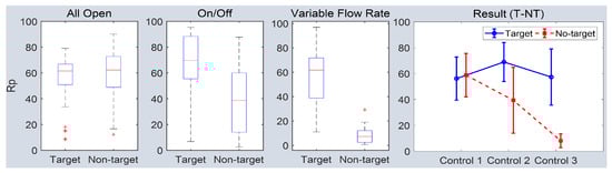 The experiment was conducted in 2020. The experiment results are shown in Figure 7. The performance baseline was control 1, which did not involve a control method (i.e., traditional spraying method). The performance was compared using . The experiment was performed in two trials, with 54 WSPs used on areas to be sprayed (target) and not to be sprayed (non-target). A higher performance meant that the target exhibited a high and the stage exhibited a low . For the target, the values were 56.15% (±17.24%), 68.95% (±21.12%), and 57.33% (±21.73%), with the pesticide usage being 25 L, 19.6 L, and 12.7 L for the different control methods. The performance was satisfactory for all cases because the target was always higher than that of control 1. The values for the non-target cases were 58.80 (±16.83%), 39.37 (±26.54%), and 8.08 (±5.97%). Controls 2 and 3 showed lower than that of control 1. In other words, the undesired area was not sprayed. These results indicated that the proposed method could minimize spraying in areas in which variable control is not desired while optimizing the amount of pesticide used. In addition, the performance could be ensured even in unstructured environments because optimization was conducted based on preliminary experiments.