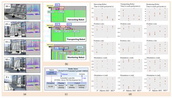 Autonomous driving system; (a) autonomous driving experiment in a smart farm, (b) scenario of a harvesting robot (short-distance path planning with static obstacles), transporting robot (long-distance path planning with static obstacles), and monitoring robot (path planning with dynamic obstacle), (c) hardware architecture, and (d) results of field test according to path planning algorithms.