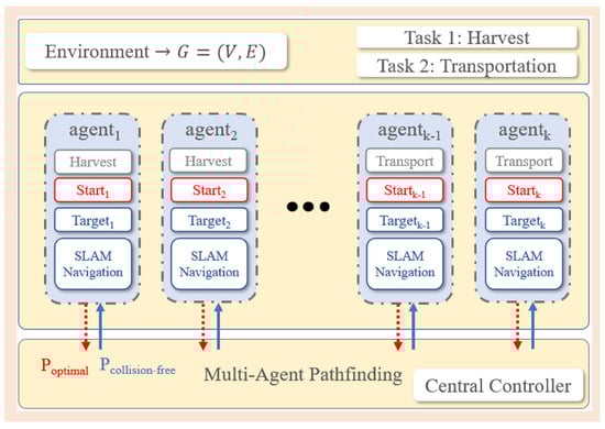 We are interested in automating agricultural tasks based on a reliable UGV platform. As described in Figure 9, this system configuration must address two principal challenges inherent in multirobot autonomous navigation. First, coordination among multiple robots is required to ensure collision avoidance. Second, each robot should navigate along an optimal path. A meticulous and rigorous investigation into MAPF algorithms is critical for addressing these challenges and achieving a practical implementation.