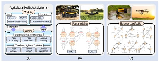 The experiment was conducted in 2019–2021. The experimental results showed that each heterogeneous robot reaches the marked state while satisfying the behavioral specifications [52,53]. Here, satisfying behavioral specifications means executing tasks without issues while achieving pre-designed control objectives. The proposed approach can efficiently compute the system model by synthesizing hybrid models and implement the desired control policy based on the design of the behavioral specifications. In other words, hybrid systems offer high scalability and suitability for large-scale, dynamic agricultural environments, as they systematically model, control, and analyze both homogeneous and heterogeneous multirobot systems. This method, facilitating cooperation among heterogeneous field robots, is well-suited to address many existing challenges in agricultural robotics and holds significant potential for future agricultural applications requiring coordinated multirobot collaboration.