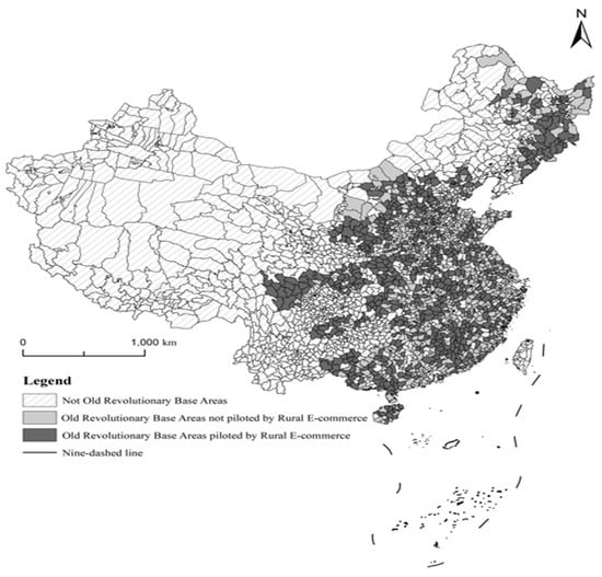 The old revolutionary area is the living and military support areas established under the leadership of the Communist Party of China (CPC) during the Agrarian Revolutionary War (1927–1937) and the War against Japanese invasion (1937–1945). These areas cover more than 1300 county-level districts in 27 provinces (or autonomous regions or municipalities of the same level). During the war years, the old revolutionary base areas nourished the CPC and the people’s army under its leadership, provided the fighters, reserves, food, and funds needed to persevere in the long-term struggle, and contributed greatly to the strengthening of the revolutionary forces. These revolutionary areas overlap with hilly areas, inter-provincial adjacent areas and environmentally fragile areas, and are also economically underdeveloped and poverty-stricken areas in China [11]. Classical political economy provides an analytical pillar for the role of history and the necessity of social class analysis in the study of sustainable development. Due to the unique historical and political reasons, it is very important to promote the development of agricultural economy and sustainable development in China’s old revolutionary base areas [13]. The lack of endogenous driving force for economic growth and the poverty of residents are extremely serious problems, which pose challenges to China’s balanced regional development and common prosperity [14]. Geographic distance and infrastructure constraints have formed an island effect on the population in these poor areas, further restricting the development of revitalization industries [15]. With the embedding of information facilities and digital technologies in rural areas, the Internet has become the driving force for rural industrial development and market expansion [16], which provides the possibility for the digitization of agricultural markets to promote the poor regions to achieve leapfrog development.