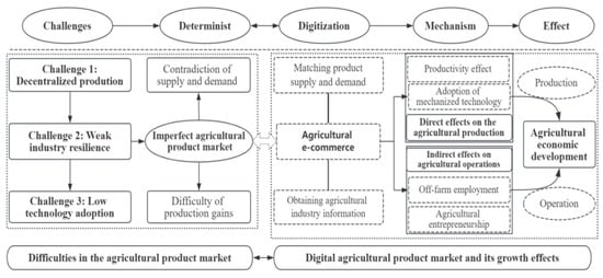 The fundamental industry for economic takeoff in underdeveloped areas is agriculture, and some classic theories have discussed the importance and driving mechanisms of agricultural economic development [40,41]. The theory of agricultural industrialization proposes that agricultural economic development can provide a material foundation for industrialization in developing countries and regions, as well as the main support for labor transfer and product demand for industrialization [40]. Although agriculture is crucial for the economic development of underdeveloped areas, it often faces challenges such as decentralized management, weak industrial resilience, low willingness to adopt technology, and low technological content. Therefore, public subsidies or price controls have become the mainstream theory in the agricultural field. Nevertheless, market factors are the core challenge for the lagging agricultural economic development in underdeveloped areas, and market mechanisms can promote agricultural economic development through direct and indirect effects. Figure 2 shows the theoretical framework of this study, namely the nexuses of product markets, e-commerce, and growth in the agricultural sector.
