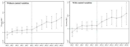 where the core explanatory variables are beforeit and afterit, which are dummy variables indicating the year from the implementation of the rural e-commerce policy. If the pilot area is in year t before the policy implementation, beforeit takes the value of 1, and otherwise, it is 0. The value of afterit is similarly known. Based on the time of policy release and the lag of data collection, this study took the year when the comprehensive demonstration policy of e-commerce entering rural areas was promulgated as the dividing line, and chose 6 years before and after the implementation of the policy as the leads and lags, respectively, to conduct parallel trend tests for the group without the control variables and the group with the control variables. As can be seen from Figure 3, the confidence intervals of the estimated coefficients before the policy pilot are intersected with the horizontal axis, and the trend of change is flat. It indicates that there is no systematic difference in the level of agricultural economic index between these two types of counties before the interference of rural e-commerce policy. After the implementation of the policy, the index of agricultural economic development of pilot counties is significantly higher than that of non-pilot counties, which is consistent with the core hypothesis that digital market drives agricultural prosperity.