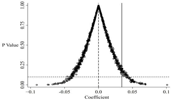 A placebo test was further constructed to exclude the effect of other randomization factors. Among the 1230 districts in the research sample of this paper, 100 districts are randomly selected and set as the experimental group, and the other districts are set as the control group. Assuming that the year of e-commerce policy implementation is 2013, 1000 regressions are conducted on the basis of the double difference model. As shown in Figure 4, the coefficients generated by the spurious policy shocks are centrally distributed around 0, and the p-values are mostly distributed above 0.1, which is in line with the expectation of the placebo test and further proves the robustness of the model.