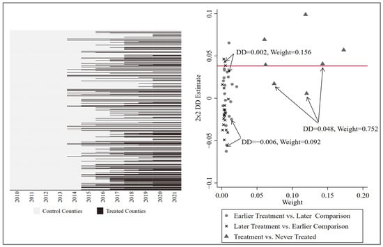 Time-varying DID estimates obtained using ordinary least square (OLS) may be biased when there are multiple policy shock time points. In this paper, we refer to the existing literature and use the robust estimation method of Goodman–Bacon decomposition to verify the robustness of the research results. Figure 5 shows the bias due to different shock time points with time-varying effects for rural e-commerce policies. This difference arises from the comparison of Earlier Treatment with Later Treatment. Because the implementation year of the policy was 2014, there were no “always-treated” counties in this study. The estimates for Later Treatment and Earlier Treatment are positive (0.0002), as are those for Treatment and Never Treated (0.048). However, the estimate for Treatment and Later Treatment is negative, which explains the overall bias in the estimates, but accounts for a smaller proportion of the more stable regression results.