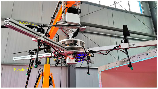 The two-phase flow UAV spraying platform consists of a spraying system and a rotor platform, as shown in Figure 1. The rotor platform is compatible with various UAV models, such as quadcopters, hexacopters, or octocopters. It can simulate the actual rotor flow field during plant protection UAV operation by controlling and monitoring the rotor speed through a mobile terminal. The spraying system is connected to the UAV rotor platform, with the nozzle located 30 cm below the rotor. The rotor used is from the DJI T30 plant protection UAV with a dimension of 91.44 cm. This test focuses on studying the spraying characteristics of a single nozzle under the influence of a single rotor-generated flow field, without considering the mutual interaction between multiple nozzles and multiple rotors.
