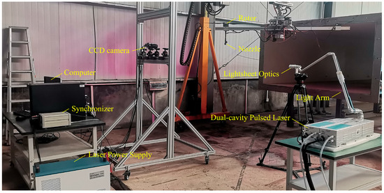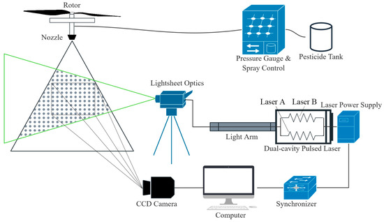 The measurement and acquisition of the droplet deposition velocity field were conducted using PIV (TSI Incorporated, Minneapolis, MN, USA), as shown in Figure 2. PIV system mainly consists of dual-cavity pulsed laser, lightsheet optics, laser power supply, light arm, high-resolution inter-frame CCD camera, synchronizer, and computer. The dual-cavity pulsed laser operates at a maximum frequency of 15 Hz, generating two distinct lasers, laser A and laser B, which can emit alternately. Each laser has a maximum single-pulse energy of 2 J and a maximum pulse duration of 10 ns. The PIV system is capable of measuring velocities up to 200 m/s, with a measurement range of at least 600 mm × 400 mm. The synchronizer serves as the timing controller for the PIV system, used to coordinate the operation timing between the dual-cavity pulsed laser generator, high-resolution inter-frame CCD camera, and computer to ensure the accuracy of capture.