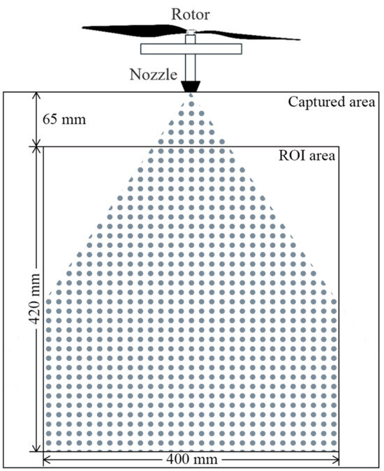 The initial detecting position for droplet velocity was chosen directly below the nozzle at a distance of 65 mm to make sure droplets were sufficiently atomized. The region of interest (ROI) area is 400 mm × 420 mm, as depicted in Figure 4. For each designated operating condition, the experiment captured 200 sequential instantaneous images of the droplet flow field, repeated three times.