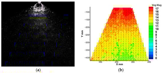 The images of droplet deposition captured by the PIV system are automatically transferred and saved to the computer, and the Insight 4G software is used to calculate the velocity vector data. The original image is shown in Figure 5a. To ensure the effectiveness of the data, the captured images must have a uniform particle distribution and sufficient particle concentration. In the Insight 4G software, the query window size of 64 × 64 pixels and a 25% overlap spacing are set to minimize particle correlation noise and ensure that the effective particles in each query window are between 8 and 20. Additionally, a standard deviation filter is used to reduce errors and outliers. Finally, the calculated droplet velocity data are imported into Tecplot Focus 2013R1 software (Tecplot Corporation, Bellevue, WA, USA) for visualization processing; the result is shown in Figure 5b.