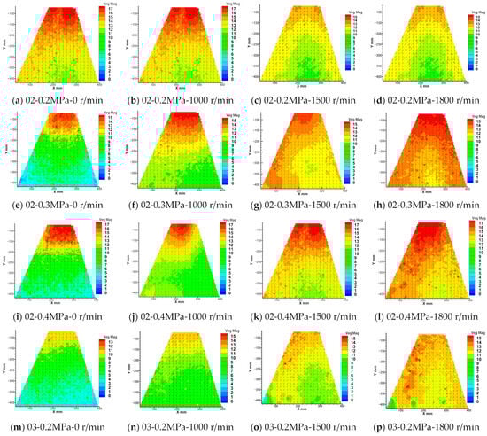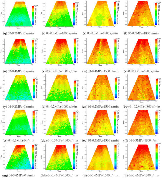 Droplet velocity map: under the condition of nozzle (02, 03, and 04), spray pressure (0.2, 0.3, and 0.4 MPa), and rotor speed (0, 1000, 1500, and 1800 r/min).
