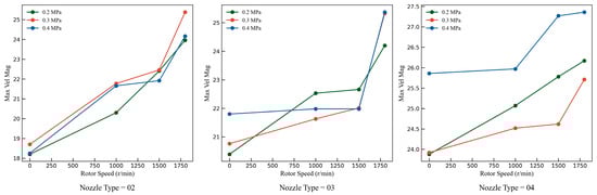 At a rotor speed of 0 r/min, as the nozzle diameter increases, the droplet size increases, and the maximum droplet velocity gradually increases. At a spray pressure of 0.2 Mpa, changing the nozzle model from 02 to 03 or 04 results in maximum droplet velocity increases of 12.03% and 31.21%, respectively. At a spray pressure of 0.3 Mpa, changing the nozzle model from 02 to 03 or 04 leads to increases in maximum droplet velocity by 11.02% and 27.91%, respectively. At a spray pressure of 0.4 Mpa, changing the nozzle model from 02 to 03 or 04 results in maximum droplet velocity increases of 19.45% and 41.70%, respectively. It can be inferred that in a static environment without the influence of rotor airflow, the movement speed of small droplets is easily affected by air drag and the forces exerted by other droplet groups in the environment, whereas larger droplets are less affected. Therefore, the maximum droplet velocity increases with the enlargement of the particle diameter.