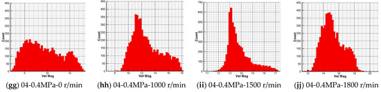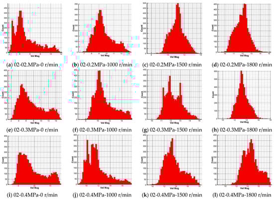 Figure 8 illustrates the distribution of droplet quantities at various speeds under different experimental conditions. Based on the experimental data, droplet velocities are categorized as follows: Speeds ranging from 0 to 6 m/s are defined as low-speed droplets; speeds from 6 to 12 m/s are termed medium-speed droplets; and speeds exceeding 12 m/s are classified as high-speed droplets.
