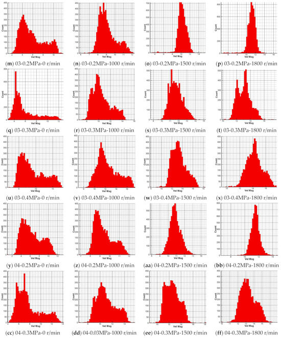 As the rotor speed continues to increase, the distribution of droplet velocities begins to assume a normal distribution shape, with a narrower speed range and higher peak values. This suggests that the rotor flow field causes the previously dispersed speed distribution to become more concentrated and uniform. When the rotor speed increases to 1500 r/min, the peak droplet velocity is observed within the range of 11.5–12.5 m/s, with the peak quantity being about 400–700 droplets. The overall droplet velocity ranges from 9 to 15 m/s. At a rotor speed of 1800 r/min, the peak droplet velocity appears within the range of 11.5–14 m/s, with the peak quantity being approximately 400–800 droplets, and the overall droplet velocity is primarily concentrated within the range of 12–18 m/s, with the highest number of droplets in the high-speed range. Additionally, it can be observed that the speed distribution range at 1800 r/min is narrower than that at 1500 r/min, and the normal distribution pattern is more pronounced, indicating a more concentrated droplet velocity distribution at this speed.