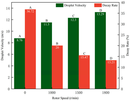 The average decay rates of droplet velocity at rotor speeds of 0, 1000, 1500, and 1800 r/min are 36.72%, 20.00%, 15.47%, and 13.21%, respectively. As rotor speed increases, the decay rate of droplet velocity gradually decreases. Rotor speed significantly affects the decay rate of droplet velocity (p = 0.039), showing significant differences in decay rates under different rotor speed conditions. The largest reduction in the decay rate of droplet velocity occurs as rotor speed increases from 0 r/min to 1000 r/min, reaching up to 16.72%. However, as rotor speed further increases, the decreasing trend in the decay rate of droplet velocity slows down to below 5%. This demonstrates that the rotor flow field generated by rotor speed has a significant impact on the decay rate, which helps to mitigate the reduction in droplet velocity, enabling droplets to deposit quickly in the target area.