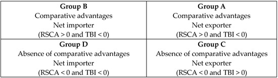 Combined with Lafay’s Trade Balance Index (TBI), the RSCA allows the formation of a matrix [33] for an objective assessment of the competitiveness of the countries considered with respect to certain commodities in selected markets. The matrices allow the splitting of the countries covered by this analysis into four groups by level of comparative advantage and export specialization (Figure 1). Therefore, they provided a basis for checking whether a country has a revealed comparative advantage and if it is a net importer or exporter of certain commodities. Indeed, Widodo [33] believed that a situation may occur where a country has a revealed comparative advantage in producing a commodity (RSCAij > 0) while not being a net exporter of it. In another case, a country may have a negative RSCAij for a specific commodity, which does not necessarily mean it is a net importer of it [20].