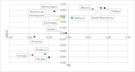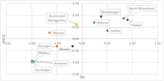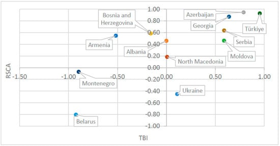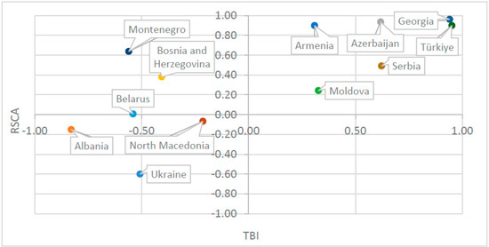 Positive TBI values indicate an export-specialized country and represent a trade surplus, whereas negative values are interpreted as the absence of specialization and indicate countries other than net importers of the product or product group concerned [42,43].