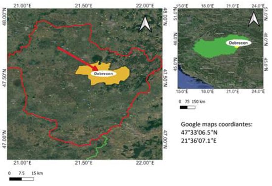 Map of Hungary and Subregion Hajdú-Bihar county with subregion and city of Debrecen where the experiment was set up.