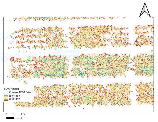 Research field NDVI map (QGIS environment). The filtered version contains only maize plants pixel on the colored NDVI channel.