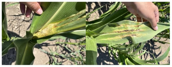 The first recordings were made in the third (June 23) (20 days after the infection—20 DAI) and fourth weeks (30 June, 27 DAI) after the artificial infection. After the third and fourth weeks of infection, the symptoms and tissue damage were observed in the infected plots. The surface chlorosis and the yellowing of the foliage revealed the typical characteristics of the infection (Figure 4).