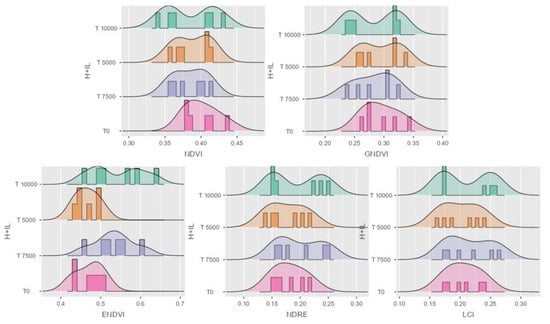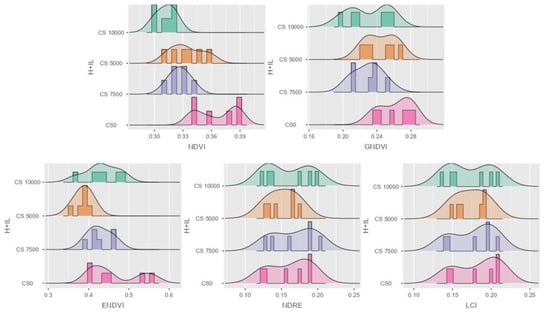 Data distribution in histogram with density for the five VIs. NDVI, GNDVI, ENDVI, NDRE, and LCI in forage maize P9025 hybrid. H + IL stands for hybrid and infection level.