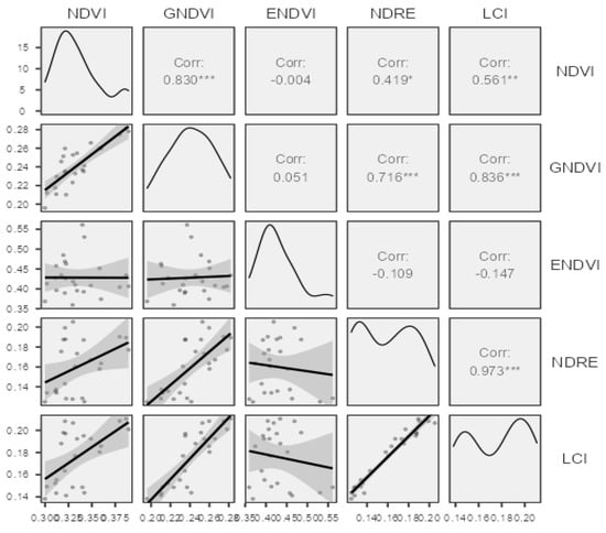 The authors were also interested in the correlation coefficients of the observed vegetation indices (Figure 5), and in determining which correlated positively. NDVI had a strong correlation with GNDVI (r = 0.83), a medium correlation with LCI (r = 0.56) and a weak correlation with NDRE (r = 0.419). There was also a strong correlation between the values in the case of LCI and GNDVI, with a value of r = 0.836. NDRE and GNDVI indices had correlation coefficients with a CCoeff of r = 0.716.