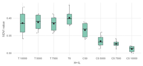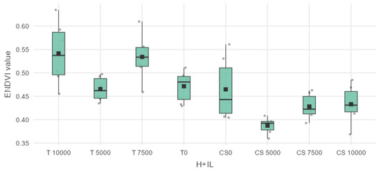 When the values of ENDVI were as shown in the table, T 10,000 was found to be significantly different from CS 5000 with a mean difference of 0.15432 *** and p value 1.42 × 10−5, from CS 7500 with a mean difference of 0.11348 ** and a p value of 0.00195, and the high-dosed sweet maize plots CS 10,000 showed a mean difference of 0.108638 ** with a p value of 0.00338. T 5000 showed no statistical difference according to the ENDVI values. However, T 7500 forage maize was significantly different from CS 5000, with a mean difference 0.14681 *** and a p value of 3.59 × 10−5. T 7500 was also significantly different from CS 7500, with a mean difference of 0.10597 ** and a p value of 0.00456. CS 10,000 had a mean difference from T 7500 of 0.101127 ** with a p value of 0.00777. The non-infected forage maize parcel T 0 was also significantly different from CS 5000, with a mean difference of 0.08413 * and a p value of 0.0442. The results can be seen in the boxplot diagram in Figure 9.