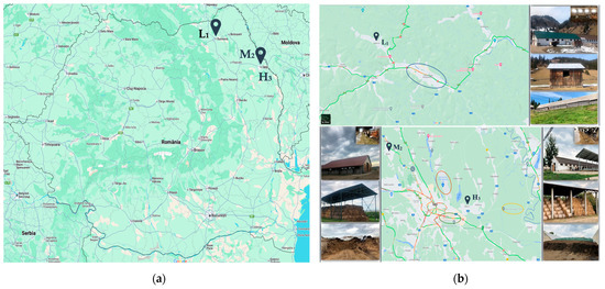 Sampling sites: (a) Farms’ locations within Romania, with codes indicating the contamination risk level: low (L), medium (M), and high (H). (b) The location of L1 farm (mountain area—low contamination) in relation to the nearest major city in the region (Suceava County); the locations of M2 farm (rural area—medium contamination) and H3 farm (urban area—high contamination), highlighting the proximity to the nearest urban area (Iasi city). Symbols show the main sources of pollution in the vicinity of the farms. The colour indicates the estimated pollution risk level of the sources near the sampling sites: red (high pollution risk, intense air transport), yellow (moderate risk, small-scale industry), green (low pollution risk, sporadic pollutant emissions), and blue (urban pollution).