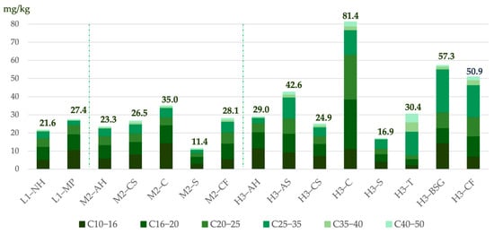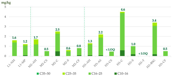 MOSH and MOAH contamination for all feeds is indicated by the hydrocarbon range (n-C; 6 MOSH sub-fractions and 4 MOAH sub-fractions) and the total area (n–C10–50). The data synthetically present the average results and summarise the overall situation of contamination levels with MOSH (Figure 2) and MOAH (Figure 3) of each type of feed. MOSH and MOAH concentrations are expressed in mg/kg. The quantification in the n-C10–50 range was achieved by integrating the peaks, respecting the performance criteria described in the JRC guide [36], according to the European Commission regulations [52].