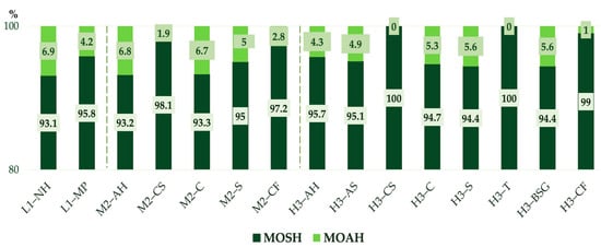 MOAH concentrations showed some variability, with certain samples, such as H3–AH (12.7%) and H3–BSG (5.6%), presenting higher proportions. On average, in our samples, MOAH accounted for 4.74% of the total MOH content, which raises concerns because of the toxic nature of this fraction. Although this percentage may appear small, even the small amounts of MOAH in feed can be alarming for food safety if transferred into food products. Considering the lack of clearly defined European limits for MOAH in food or feed, it is recommended to minimise contamination as much as possible, ideally reaching an absence of MOAH in feed, to reduce the risk of transfer into the food chain.