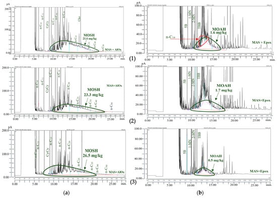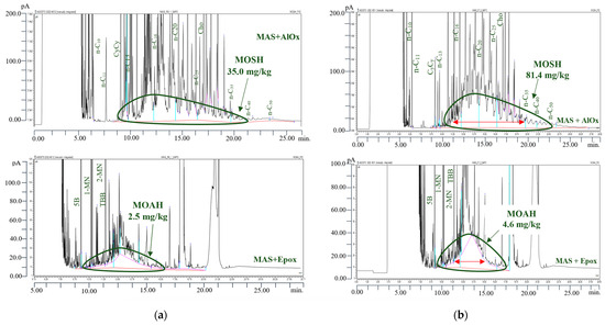 MOHs’ toxicity remains a distinct concern in specialist research because of the uncertainties related to their effects on living organisms. Recent studies indicated an increased capacity of MOSH to accumulate in human organs and tissues, which may generate health risks [30,31,32]. More, MOAHs are structurally similar to polycyclic aromatic hydrocarbons (PAHs), have carcinogenic potential, and can exert genotoxic effects, especially the variants with three or more aromatic rings [22,33].