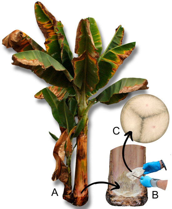 Sampling and pathogen isolation process. (A) Banana plant with symptoms of Panama disease. (B) Selection of a corm sample with xylem necrosis. (C) Foc-STR4 colonies isolated in PDA medium (25 °C, 7 days).