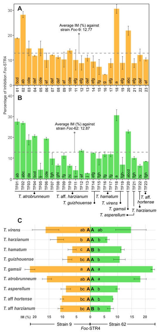 In vitro antifungal activity of Trichoderma spp. against Foc-STR4 in the cellophane membrane assay (IM). (A,B): Percentage of inhibition (% IM) of Foc-STR4 strain 9 (A) and 62 (B) with each Trichoderma isolate. (C): % IM of Foc-STR4 with each Trichoderma species (average of the % IM of the isolates of each species). Different lower-case letters in bars indicate significant differences (Fisher’s LSD, p < 0.05) between each Trichoderma isolates (A,B) or species (C) against each Foc-STR4 strain. Different capital letters in bars (C) indicate significant differences (p < 0.05), according to the t test) between Foc-STR4 strains in the same Trichoderma species. Error bars represent the standard error of the mean.