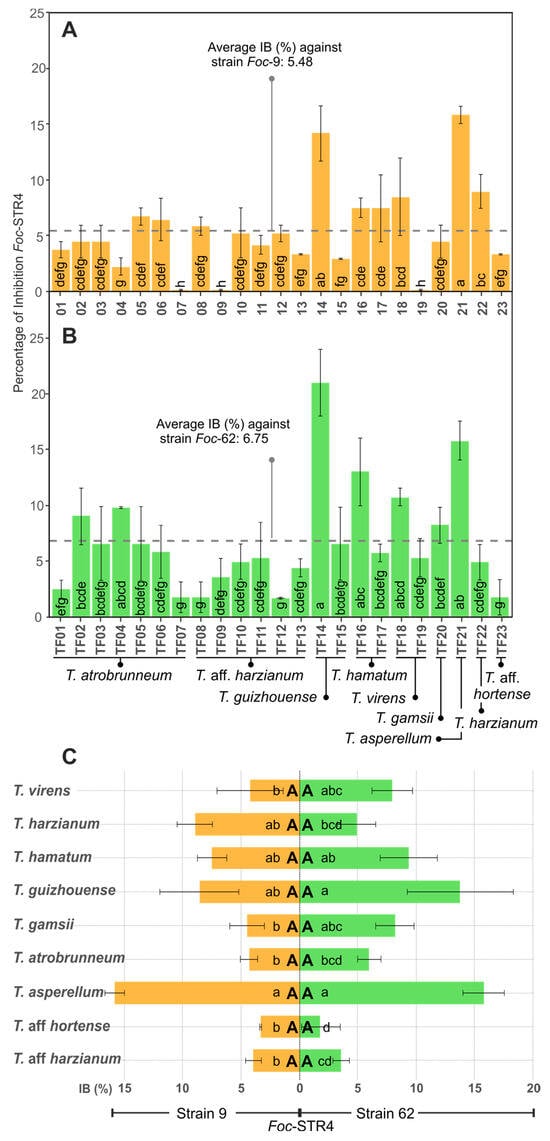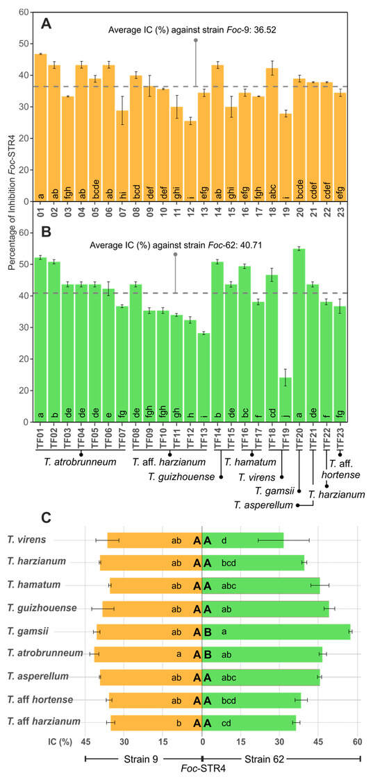 In vitro antifungal activity of Trichoderma spp. against Foc-STR4 in broth assays (IB). (A,B): Percentage of inhibition (% IB) of Foc-STR4 strain 9 (A) and 62 (B) with each Trichoderma isolate. (C): % IB of Foc-STR4 with each Trichoderma species (average of the % IB of the isolates of each species). Different lower-case letters in bars indicate significant differences (Fisher’s LSD, p < 0.05) between each Trichoderma isolates (A,B) or species (C) against each Foc-STR4 strain. Different capital letters in bars (C) indicate significant differences (p < 0.05, according to the t test) between Foc-STR4 strains in the same Trichoderma species. Error bars represent the standard error of the mean.
