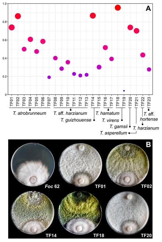 In vitro antifungal activity of Trichoderma spp. against Foc-STR4 considering the dataset from all assays. (A) represents the transformed (normalized) dataset of the three assays (membrane % IM; broth % IB; direct confrontation % ID), where “0” represents the lowest percentage of inhibition in the set of assays and “1” the highest percentage. The color and diameter of the circles within the graph represent the level of the values (blue and small circle = 0; red and large circle = 1). (B) shows the direct confrontation (dual culture) assay on Petri dishes (9 cm diameter) with PDA between Trichoderma isolates and Foc-STR4 strain 62 at 25 °C for 5 days. Foc-62: Foc-STR4 strain 62 control plate.