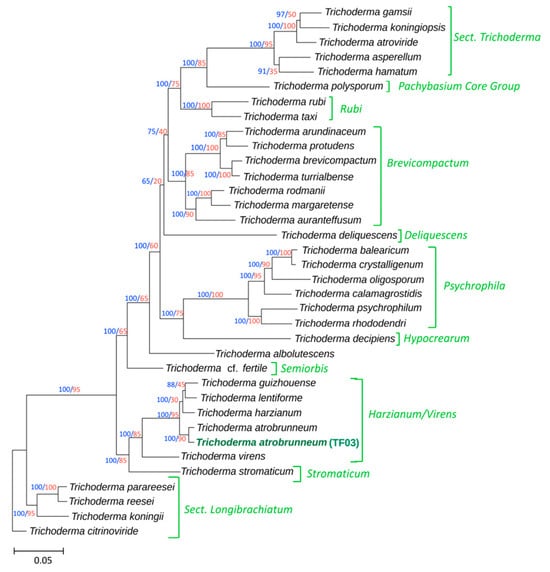 The phylogenetic tree was inferred from full-length exon sequences of 20 housekeeping genes (totaling 54,000 sites). T. atrobrunneum isolate TF03 (genome sequenced in this work) is indicated in green boldface type. Bootstrap values, calculated from 1000 pseudoreplicates, are shown in blue on each branch, while gene concordance factors (gCFs) are displayed in red. Previously identified subgeneric lineages [39,46] are indicated to the right of the tree.