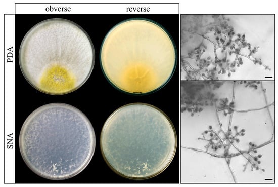 Trichoderma atrobrunneum (isolate TF03) on SNA and PDA after 7 days at 25 °C. Scale bars: 10 μm.