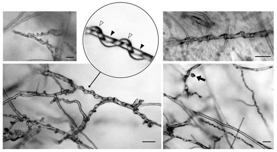 Mycoparasitism exhibited by Trichoderma atrobrunneum against Fusarium oxysporum f. sp. cubense STR4 on PDA medium at 25 °C in the direct confrontation antifungal assays. The microphotographs show the coiling and encircling of T. atrobrunneum hyphae (empty triangles) on Foc hyphae (filled triangles) after 5 days of confrontation. The filled arrow shows a Foc false head on a short lateral conidiophore. Scale bars: 50 μm.