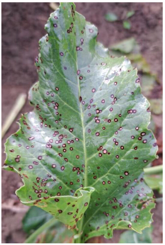 C. beticola isolates obtained from sugar beet leaves from central Poland were used for the study. Sugar beet leaves were collected in October 2020. The leaves were air dried and stored in paper bags. Sections of the dried leaves with CLS symptoms were incubated for 48 h in a wet chamber (RH > 80%) at room temperature (20–22 °C). The CLS symptoms are small spots with a characteristic reddish-brown border (Figure 1). The colonies of C. beticola that grow on PDA (Potato Dextrose Agar; Oxoid Ltd., UK) are light gray to brown in color. The mycelium is velvety and low, growing a little above the medium. The conidial spores are long and needle-like. It has smooth walls and, depending on environmental conditions, 3 to 24 cross-walls, but usually 3 to 14 [26]. C. beticola forms unbranched, slightly geniculate conidiophores that are light brown at the base and become lighter toward the top [4]. The conidial spores of C. beticola were collected from the leaf fragments using a preparation needle and used to prepare an aqueous spore suspension for the inoculation of PDA (Potato Dextrose Agar; Oxoid Ltd., Hampshire, UK) in 90 mm Petri dishes. The dishes were incubated at room temperature (20–22 °C) for 7–10 days. Subsequently, the morphological features of the colonies were verified and conidial spores [30] were transferred to new agar plates. The isolates are stored at the Regional Experimental Station in Toruń. The collection is stored in a refrigerator at 4 °C on PDA plates protected with parafilm and renewed every 12 months.