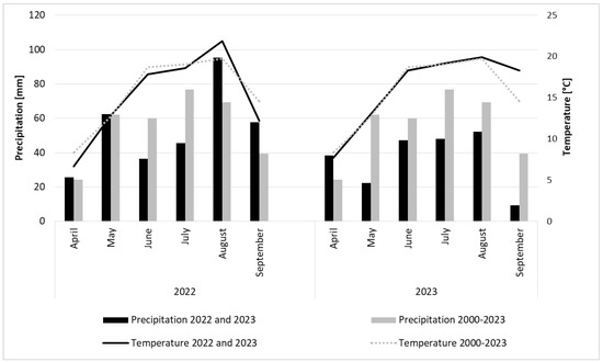 Weather conditions (average temperature and precipitation) at experimental location Falęcin in years 2022 and 2023.