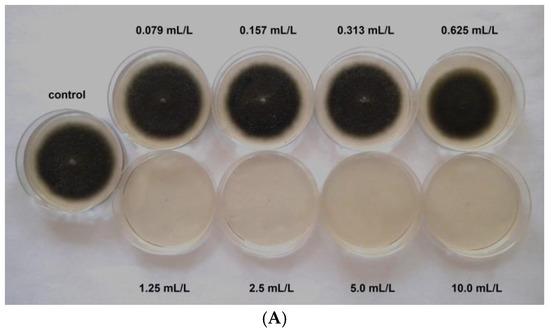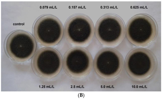 Antifungal activity of EO against C. beticola isolate 30B; (A) thyme EO showed a MIC of 1.25 mL/L, (B) grapefruit EO showed a MIC higher than 10.0 mL/L.