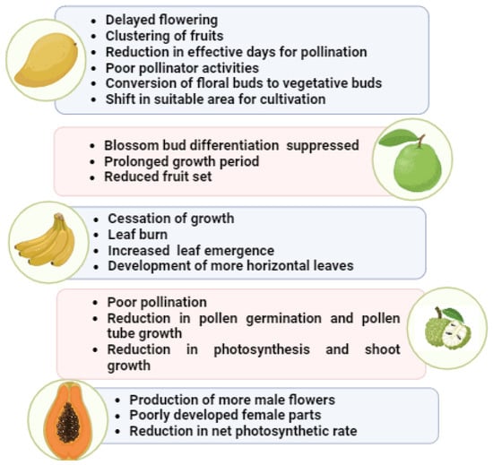 Temperature also affects the orientation of leaves in bananas; low temperature results in upright leaves, whereas high temperature results in horizontal leaves [48]. When the temperature increases by 1 °C, there will be a shift in the area of cultivation of bananas by 200–300 km in mid-latitudes [14]. In papaya, at higher temperatures, there is a tendency for bisexual cultivars to produce male flowers with poorly developed female parts; in addition, the net photosynthetic rate also decreases above 30 °C [47]. In annona, poor pollination occurs under high temperatures (30 °C) and low humidity (30%) with effective pollination at 25 °C temperature and 80% relative humidity. Pollen germination and pollen tube growth are also reduced under high temperatures [47,49]. Rise in leaf temperature, reduced stomatal conductance and leaf vapor pressure deficit occur in annona due to high temperature and irradiance. Hence, photosynthesis and shoot growth are affected [50]. Figure 3 represents the effect of high temperatures on major tropical fruits such as mango, guava, banana, annona and papaya.