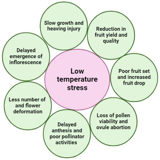 Injuries due to low temperature or cold stress in plants are of two types: chilling injury and freezing injury. Chilling injury occurs at temperature range of 0–15 °C, it will not cause ice crystal formation in plant tissues. The chilling injury cause damage to cell membrane, reduces uptake function of roots leading to water balance disorders, lowers photosynthetic rate and retards plant growth. Freezing injury occurs at a temperature below 0 °C, with ice crystal formation in plant tissues. The ice crystal formation can be intercellular (when temperature falls gradually) or intracellular (when there is a sudden fall in temperature), latter one directly affects the cell metabolism and hence more dangerous. These injuries further lead to suffocation and heaving, ultimately affecting yield of the crop. Tropical and subtropical plants are more susceptible to low temperatures than temperate plants due to the lack of cold acclimatization [12,51]. The impact of low temperatures on tropical fruit crops, in general, is illustrated in Figure 4. Dinesh and Reddy reported that temperature less than 20 °C for mangosteen trees leads to slow growth and lower numbers of flowers [46]. When the temperature drops below 10 °C, bananas may develop the ‘choke throat’ disorder, which adversely affects the emergence of leaves and inflorescence, leading to poor fruit development [47]. In annona, anthesis time is delayed by one hour when the temperature decreases from 25 °C to 15 °C [49]. Low temperatures in the range of 4–11 °C combined with high humidity and cloudy weather delay panicle emergence in mango. Early flowering and poor fruit set in mangoes occur as a result of low night temperatures, whereas low day temperatures result in a greater proportion of male flowers and poor pollinator activities, which causes poor fruit set [14]. In addition, low temperatures can lead to flower deformation, loss of pollen viability, reduced number of perfect flowers, and ovule abortion, leading to the development of parthenocarpic fruit and malformation of fruits in mango [52,53].
