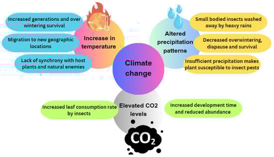 A changing climate directly affects pest reproduction, development, survival and dispersal and indirectly affects natural enemies, predators, competitors, vectors and mutualists [90]. Temperature is the most important parameter affecting insect physiology since their metabolism doubles when temperatures increase by 10 °C [91]. In tropical regions, however, a decrease in growth rate will occur because temperatures in this region have already reached the optimum level for pest development. If the temperature rises further, then growth and development will decrease [92]. Climate change results in a rise in temperature, uneven precipitation and an increase in CO2 concentration, affecting insect population dynamics, geographical distribution, growth and development, abundance, etc., as illustrated in Figure 6 [93].
