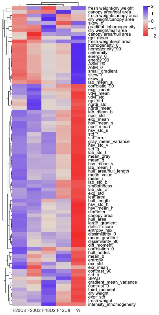 The phenotypic effects of non-visible composite light irradiation sequences on lettuce exhibit distinct differences (Figure 2). Unsupervised clustering analysis suggests that these effects can be broadly categorized into two groups for discussion. In terms of certain morphological structures, gray-level co-occurrence matrix, and color phenotypes (homogeneity_0, homogeneity_90, uniformity, energy_0, energy_90, ASM_0, ASM_90, small_gradient, skew_r, skew_g, lab_mean_a), the phenotypes under non-visible light irradiation were lower than those under control conditions. Conversely, another set of phenotypic indicators shows an opposite trend. Under the same FR treatment, the phenotypic group changed consistently, indicating that in this experiment, the duration of UVA irradiation had essentially no impact on the phenotypic groups of lettuce. Furthermore, under the same UVA irradiation duration before harvest, the phenotypic group indices of F18U2 were higher than those of F20U2, a trend also observed with F12U8 and F20U8. This suggests that FR irradiation influences the phenotype. In summary, the phenotypic effects of non-visible composite light irradiation sequences on lettuce exhibit a certain degree of regularity. These findings provide significant data support for further research into the regulatory effects of light on plant growth and development.