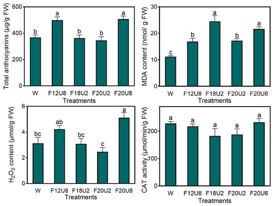 Figure 3. The effects of FR and UVA irradiation time on the stress resistance of purple lettuce. The anthocyanin content, MDA content, H2O2 content, and CAT activity were analyzed separately. Different letters indicate significant differences between data (p < 0.05).