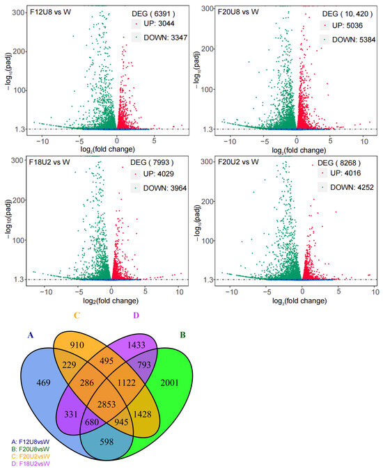 To investigate the effects of different durations of non-visible composite light exposure on the mRNA transcriptome of lettuce leaves, we conducted RNA sequencing analysis on lettuce leaves subjected to various light treatments prior to harvest (Figure 4). The results indicated that different durations of composite light exposure have varying regulatory effects on RNA expression in lettuce leaves. Specifically, the F20U8 treatment triggered the most extensive transcriptional regulation, identifying 10,420 differentially expressed genes (DEGs). The F20U2 treatment induced a broad transcriptional response, affecting 8268 DEGs. The F18U2 treatment resulted in fewer transcriptional changes, impacting 7993 DEGs. The F12U8 treatment elicited the least transcriptional regulation, identifying 6391 DEGs. Notably, 2853 genes exhibited changes in transcriptional expression across all four treatments. These findings elucidate the complexity of gene expression regulation in lettuce leaves in response to varying durations of non-visible light exposure, providing valuable insights into how such exposure durations affect plant growth and development.