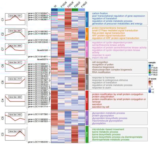 Under various light treatments, significant differences in gene expression were observed, which are further categorized into eight distinct clusters (Figure 5). Gene Ontology (GO) enrichment analysis indicates that differentially expressed genes (DEGs) associated with biological processes were significantly enriched in multiple biological functions related to plant metabolic regulation and signal transduction. Specifically, the expression of genes involved in Carbon Fixation and Gene Expression Regulation (C1), Signal Transduction and Membrane Transport (C2), Cell Cycle Regulation and Plant Hormone Response (C7), Cell Recognition and Ribosome Biogenesis (C6), Hormone Response and Metabolic Regulation (C8), Protein Modification and Secretion (C4), Glycoprotein Metabolism and Biosynthesis (C5), and Microtubule Movement and Lysine Metabolism (C3) were notably affected. DEGs related to cellular components were significantly enriched in various biological functions associated with organelle and membrane structures, as well as protein modification and genetic information processing (Figure S2). Notably, the expression of genes associated with Proton-Transporting ATPase Complexes (C1), Golgi Apparatus and Associated Structures (C2), Intermediate Filaments and Ubiquitination Complexes (C7), Ribonucleoprotein Complexes and Pre-Ribosomal Particles (C6), Ubiquitin Ligase Complexes (C8), Chromatin and Protein-DNA Complexes (C4), and Proteasome Complexes (C3) were significantly influenced. Molecular function-related DEGs were significantly enriched in biological functions related to plant enzyme activity and molecular modification, as well as DNA interaction and protein synthesis (Figure S3). The expression of genes involved in Photosynthesis and Energy Conversion (C1), Oxidoreductase Activity and Cytoskeleton Binding (C2), DNA Binding and Methylation Modification (C7), Translation Regulation and Oxidoreductase Activity (C8), Calcium Ion Binding and Oxidoreductase Activity (C4), Protein Folding and Molecular Chaperone Activity (C5), and Proteolysis and Microtubule Motor Activity (C3) were all significantly impacted. Compared to growth under visible light (W), a combination of far-red (FR) and ultraviolet A (UVA) light inhibited the expression of genes in C4 and C5, while non-visible light combinations had no significant effect on gene expression in C4. Additionally, specific light combinations, such as F20U8, promoted the expression of genes in C1, while both F20U8 and F20U2 enhanced gene expression in C2 and suppressed it in C6. F12U8 promotes gene expression in C7, F18U2 in C8, and F20U2 in C3. These findings reveal the nuanced regulatory effects of light conditions on plant gene expression and suggest that different light treatments could modulate plant growth and development by influencing specific biochemical pathways and molecular mechanisms.