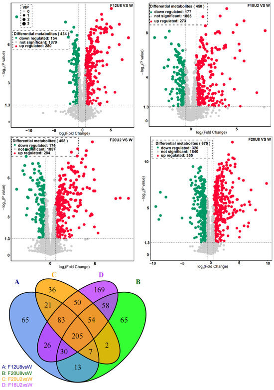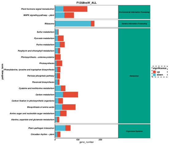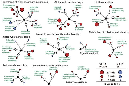 In the comprehensive metabolomic analysis using the KEGG metabolic network (Figure 10, Figures S13–S15), it was observed that under the F12U8 treatment, there was a significant upregulation in the expression of metabolic pathways such as the biosynthesis of secondary metabolites and biosynthesis of cofactors. Particularly within the lipid metabolism category, the linoleic acid metabolism and the biosynthesis of unsaturated fatty acids pathways were notably upregulated in response to F12U8 treatment. Furthermore, within the biosynthesis of other secondary metabolites category, the phenylpropanoid biosynthesis pathway was upregulated, while the glucosinolate biosynthesis and flavone and flavonol biosynthesis pathways were downregulated. In carbohydrate metabolism, the galactose metabolism pathway was upregulated, and in the metabolism of terpenoids and polyketides category, the sesquiterpenoid and triterpenoid biosynthesis pathway was also upregulated. Additionally, in the metabolism of cofactors and vitamins, the pantothenate and CoA biosynthesis pathway was upregulated. Similarly, the F18U2 treatment led to an upregulation in the expression of metabolic pathways and the biosynthesis of secondary metabolites. In the biosynthesis of other secondary metabolites, the flavonoid biosynthesis pathway was upregulated, along with galactose metabolism in carbohydrate metabolism, oxidative phosphorylation in energy metabolism, the biosynthesis of unsaturated fatty acids in lipid metabolism, and porphyrin metabolism in the metabolism of cofactors and vitamins. The F20U8 treatment resulted in an upregulation of the biosynthesis of secondary metabolites, while downregulating the expression of metabolic pathways. Within energy metabolism, the oxidative phosphorylation pathway was upregulated, as was linoleic acid metabolism in lipid metabolism and sesquiterpenoid and triterpenoid biosynthesis in the metabolism of terpenoids and polyketides. Lastly, the F20U2 treatment predominantly upregulated the biosynthesis of secondary metabolites. In the biosynthesis of other secondary metabolites, the flavonoid biosynthesis pathway was upregulated, the galactose metabolism in carbohydrate metabolism was upregulated, and the biosynthesis of unsaturated fatty acids in Lipid metabolism was also upregulated. These findings indicate that specific metabolic pathways are significantly influenced by the respective treatments, with certain pathways such as the biosynthesis of secondary metabolites, linoleic acid metabolism, and galactose metabolism being consistently upregulated across different conditions.
