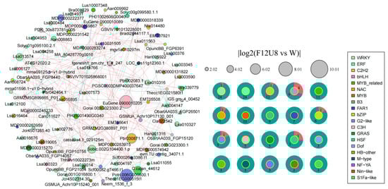 We conducted a comprehensive analysis of mRNA transcriptional level variations in lettuce under different durations of non-visible light exposure to elucidate the responses of specific transcription factor families to these changes (Figure 7, Figures S7–S9). Notably, in the F12U8 treatment, transcription factors from the WRKY, ERF, C2H2, and bHLH families also displayed significant expression changes. The WRKY family had 24 members downregulated and one upregulated, the ERF family had all 24 members downregulated, the C2H2 family had 12 members downregulated and one upregulated, and the bHLH family had nine members downregulated and four upregulated. Transcription factors OpuncBB_FGP21054, Lsa011539, and Thhalv10022273m frequently interacted within the regulatory network, highlighting their crucial regulatory roles in the F12U8 treatment’s network. Under F18U2 treatment, transcription factors from the ERF, bHLH, and C2H2 families showed significant expression changes as well, with 26 members of the ERF family downregulated and five upregulated, 14 members of the bHLH family downregulated and four upregulated, and 15 members of the C2H2 family downregulated with one upregulated. Transcription factors Thecc1EG014762t1, Lsa016760, and Han008863 frequently interacted within the regulatory network, indicating their significant centrality in the F18U2 treatment’s network. Under F20U2 treatment, transcription factors from the ERF, WRKY, and bHLH families exhibited significant expression alterations. Within the ERF family, 30 members were downregulated while one was upregulated. The WRKY family showed uniform downregulation across its 29 members. In contrast, the bHLH family had 21 members downregulated and two upregulated. Transcription factors such as Potri.006G000800.1, Pbr030871.1, and MA_11351g0010 demonstrated frequent interactions within the regulatory network, suggesting their central roles in the F20U2 treatment’s network, potentially linking to various biological processes including plant growth and development, stress response, signal transduction, and metabolic regulation. Under F20U8 treatment, transcription factors from the WRKY, bHLH, and ERF families again showed significant expression changes, with 31 members of the WRKY family downregulated, 23 members of the bHLH family downregulated and two upregulated, and 22 members of the ERF family downregulated with one upregulated. Transcription factors Potri.T074200.1, MA_11351g0010, and PH01000668G0290 frequently interacted within the regulatory network, indicating their significant centrality in the F20U8 treatment’s network. Collectively, our findings unravel the distinct impacts of varying durations of non-visible light exposure on the lettuce transcriptome regulatory network, particularly concerning the transcriptional reprogramming associated with environmental stress responses.
