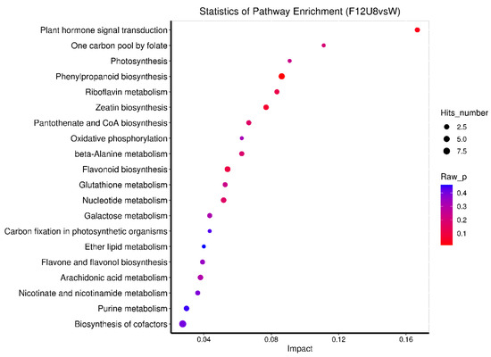 The changes in metabolic pathways under different treatments were analyzed (Figure 9, Figures S10–S12). In comparison with the control group W, the treatment with F20U2 predominantly influenced multiple metabolic pathways, including plant hormone signal transduction, starch and sucrose metabolism, photosynthesis, galactose metabolism, and ABC transporters. Notably, the ABC transporter pathway was enriched with five metabolites, the highest among all pathways assessed. The F20U8 treatment primarily elicited changes in starch and sucrose metabolism, ABC transporters, galactose metabolism, and carbon fixation in photosynthetic organisms, with the starch and sucrose metabolism and ABC transporters pathways accumulating eight metabolites, highlighting their central role in the metabolic network and potential significant impact on pathway regulation and functionality. Furthermore, the F18U2 treatment revealed alterations in photosynthesis, plant hormone signal transduction, oxidative phosphorylation, and nucleotide metabolism pathways. The nucleotide metabolism pathway was particularly enriched with five metabolites, marking it as the most enriched among the assessed pathways. Lastly, the F12U8 treatment predominantly affected plant hormone signal transduction and the one-carbon pool by folate, photosynthesis, phenylpropanoid biosynthesis, and biosynthesis of cofactors. Among these, the biosynthesis of cofactors pathway was the most enriched, with nine metabolites identified. In summary, under various treatment conditions, specific metabolic pathways exhibited significant enrichment of metabolites, indicating their pivotal role in plant metabolic regulation. Pathways such as starch and sucrose metabolism, plant hormone signal transduction, and ABC transporters demonstrated pronounced metabolite enrichment, suggesting their substantial influence on the plant’s metabolic network and physiological functions.